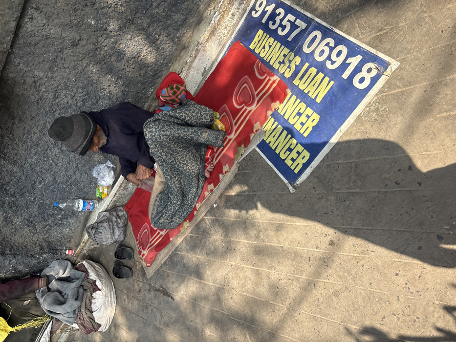An elderly couple rests on a red patterned rug, positioned beside a blue and yellow sign advertising "BUSINESS LOAN FINANCER," marked with the phone number 91357 06918. The man, wearing a dark shirt and hat, sits up while the woman, clad in a patterned outfit and head covering, lies prone. A water bottle and discarded wrappers are nearby. A bag of clothes and sandals sit to the left. The scene unfolds on a concrete surface, partially bathed in sunlight, casting shadows.