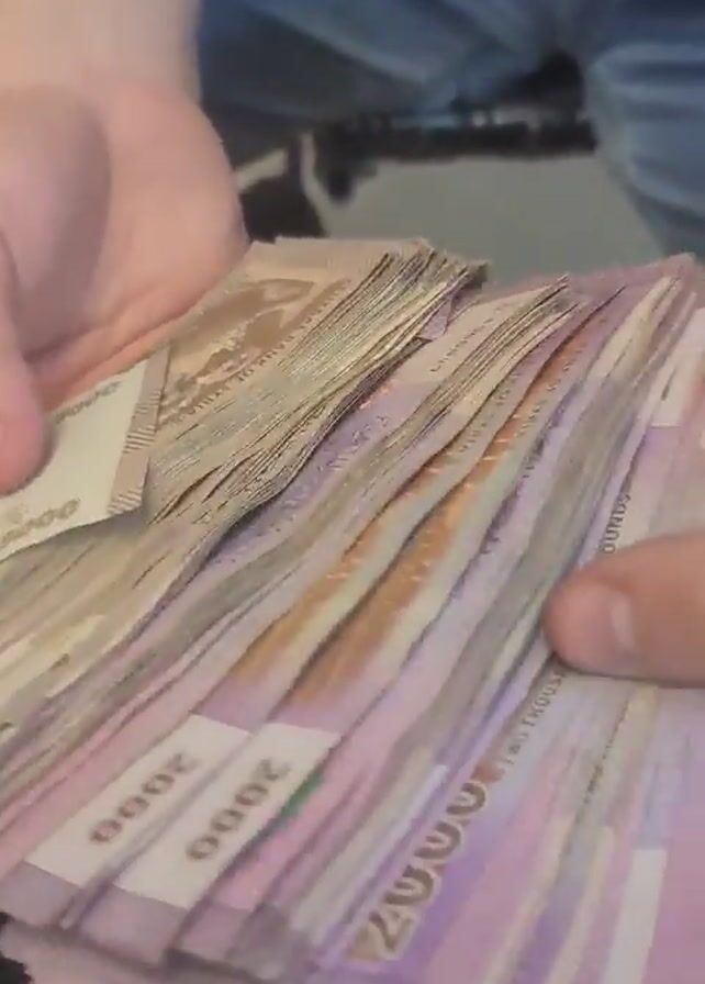 A person is sitting and holding a stack of paper money in their hands. The money is in two denominations: 5000 and 2000. The 5000 notes are light brown, while the 2000 notes are lilac. The person is wearing blue jeans and a dark top.