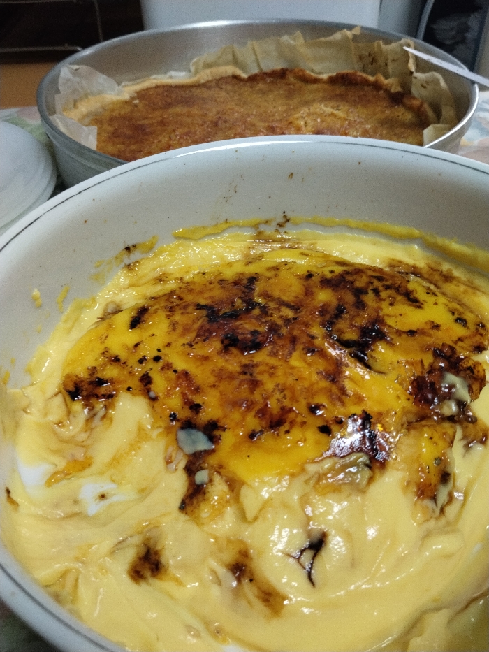 The image displays two prepared desserts on a surface, likely a table, within an indoor environment in Vila Real, Portugal. In the foreground, a white ceramic bowl contains a yellow, creamy dessert featuring a partially caramelized, dark brown, and glossy sugar topping with irregular burnt patterns. The underlying creamy base exhibits a thick, swirled texture. In the blurred background, a metallic round baking pan holds a separate golden-brown baked item, possibly a tart or cake, with parchment paper lining its interior edges. No individuals are present, and no specific actions or interactions are depicted.