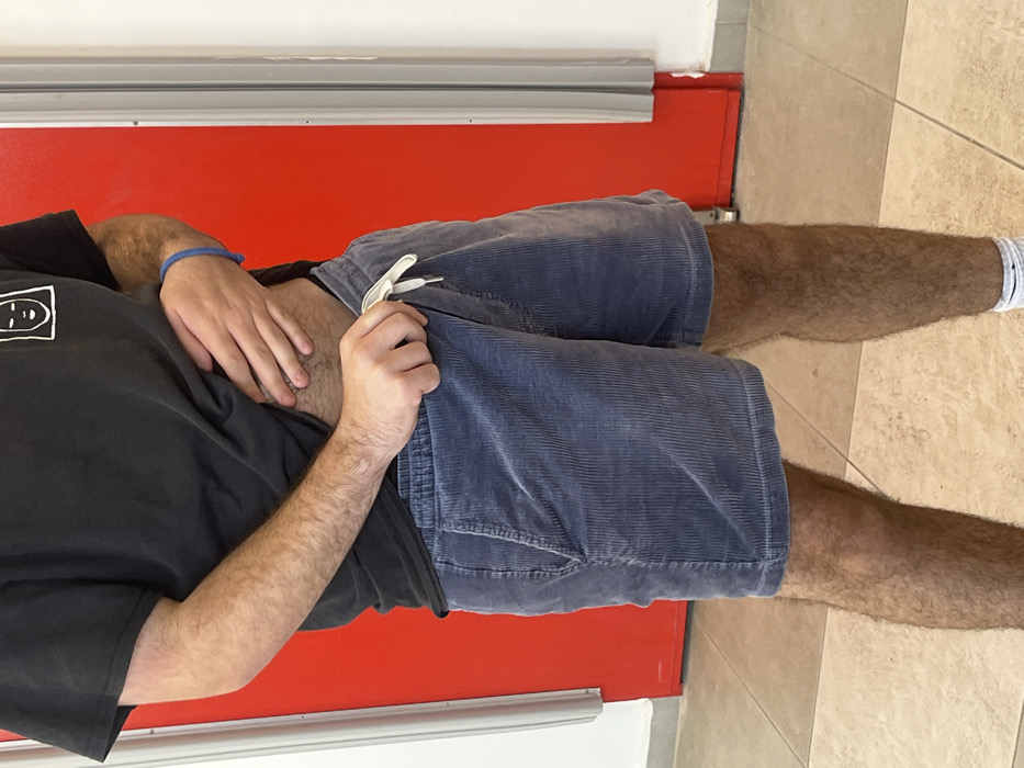 The image displays a male individual from the mid-torso down, standing indoors. He is wearing a black short-sleeved t-shirt with a white rectangular graphic on the upper left chest, and blue corduroy shorts featuring a visible white drawstring at the front. A blue wristband is present on his right wrist. His left hand rests on his exposed, hairy lower abdomen, while his right hand holds the drawstring of his shorts, indicating an adjustment of clothing or an internal sensation. His legs are visible and covered in hair down to the ankles. The background consists of a prominent red door or partition, flanked by white wall sections. The floor is tiled with light-colored, square tiles. The specific location within the city of Tel Aviv, Israel, cannot be determined from the visual evidence provided.