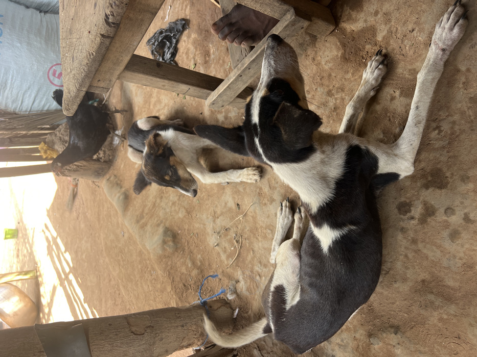 The image captures an outdoor scene in Ve Hoeme, Ghana, characterized by a light brown, uneven dirt ground illuminated by direct sunlight. In the immediate foreground, a dog with a black and white coat lies on its side, facing right, with its head slightly raised and ears erect. Its tail, predominantly white, is visible on the far left. Behind this dog, a smaller dog, also lying down, displays a brown, black, and white coat and faces towards the viewer's left. Both dogs appear lean. In the mid-ground, a black chicken stands upright, facing right, near a wooden post. A partial dark-skinned human foot is visible in the bottom right corner, positioned next to the leg structure of a wooden table or bench. The background includes a prominent wooden post on the left, secured with a blue rope. Other background elements consist of additional wooden structures, a large light-colored sack, a green bucket, and a reflective metallic object, all contributing to a sun-drenched environment with distinct shadows.