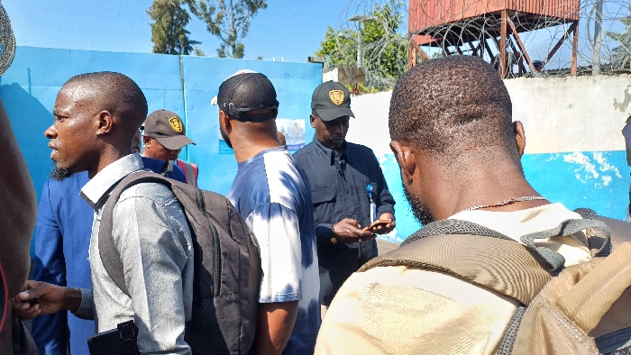 The image captures an outdoor scene in Kabinzi, Rwanda, featuring five adult males under a clear blue sky. In the foreground on the right, the back of a male subject's head and shoulders are visible, showing short dark hair and a beard; he wears a light-colored t-shirt and a tan backpack, with a silver chain around his neck. To his left, a male subject with short dark hair and a beard is seen in profile, facing left with his mouth slightly open, wearing a grey long-sleeved shirt and a black backpack. A dark rectangular object, possibly a phone, is visible tucked into his left hip area. A male in a blue suit is partially visible behind him. Central to the frame, a male subject is viewed from behind/side, wearing a blue and white tie-dye t-shirt and a black mesh baseball cap. To his right, a male subject in a dark blue/black short-sleeved uniform shirt, with an attached lanyard and ID card, wears a dark baseball cap featuring a yellow emblem. He holds a small, light-brown rectangular object, possibly a wallet or phone, in both hands, appearing to examine it. Another male in a dark cap and a high-visibility vest is partially visible further back on the left. The background features a prominent light blue wall with white patches. Behind this, to the right, a reddish-brown corrugated metal structure, possibly a watchtower, is visible, topped with multiple strands of razor wire. Additional razor wire is present along a white wall segment to the left of the corrugated structure. Trees are visible above the background structures.