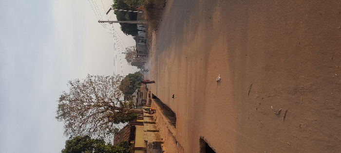 A road stretches into the distance under a pale sky. Sparse trees and buildings line the left side, while the road itself dominates the right. Power lines cross overhead. In the middle of the road, faint smoke rises, obscuring some background details. Patches of dirt and debris are scattered on the road surface. A ditch runs along the road's edge on the left. The overall scene suggests a rural or developing area.