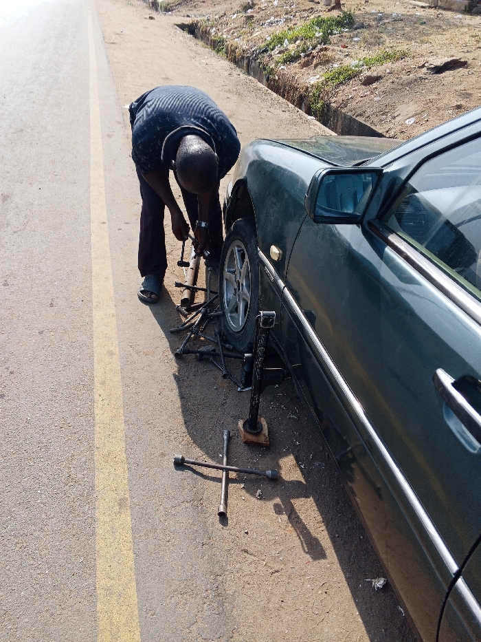 In Zango-ndaji, Nigeria, an outdoor scene depicts an adult male engaged in vehicle maintenance on the dirt shoulder adjacent to an asphalt road