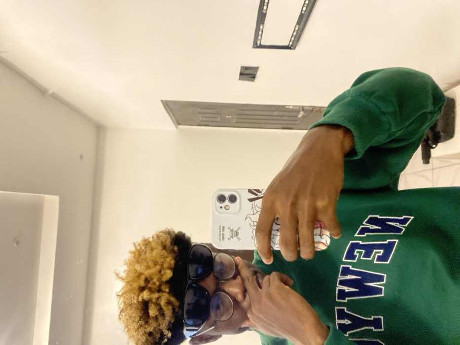 The scene is an indoor room within Igboefon, Nigeria, captured as a mirror selfie. An individual with dark skin and prominent light brown, curly hair is visible. They wear two pairs of glasses: dark-lensed wrap-around sunglasses are positioned over clear-lensed eyeglasses. A small nose ring is present on the left nostril. The subject is clad in a green long-sleeved sweatshirt bearing the mirrored text "YORK WEN" (reflective of "NEW YORK") in blue letters across the chest. Their right hand holds a white smartphone, equipped with a decorative case featuring skull and other graphic elements, used to capture the image. The left hand's index finger is observed touching the subject's nose area. The background consists of plain white walls. A dark, paneled door is positioned to the subject's right. The white ceiling displays a single recessed light fixture and a rectangular molding. Further right on the wall, a dark rectangular frame, consistent with a television mount, is affixed. A dark object, possibly a bag, is partially visible on a surface in the lower right.