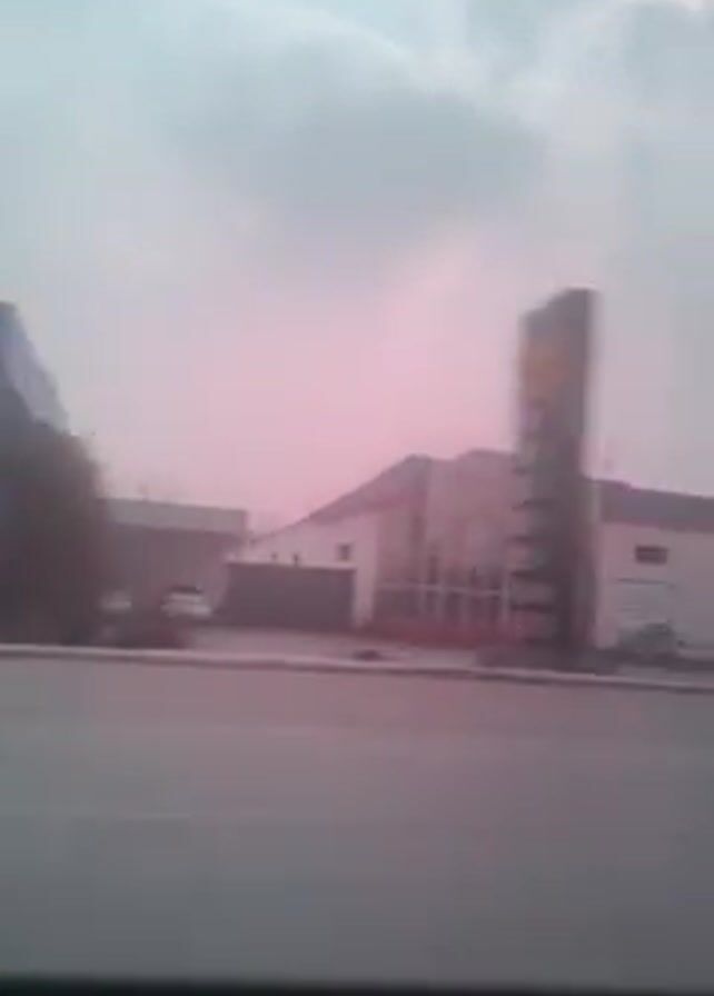 A car is driving down a road, passing a gas station and a few buildings. The sky is overcast and the light is a little hazy.