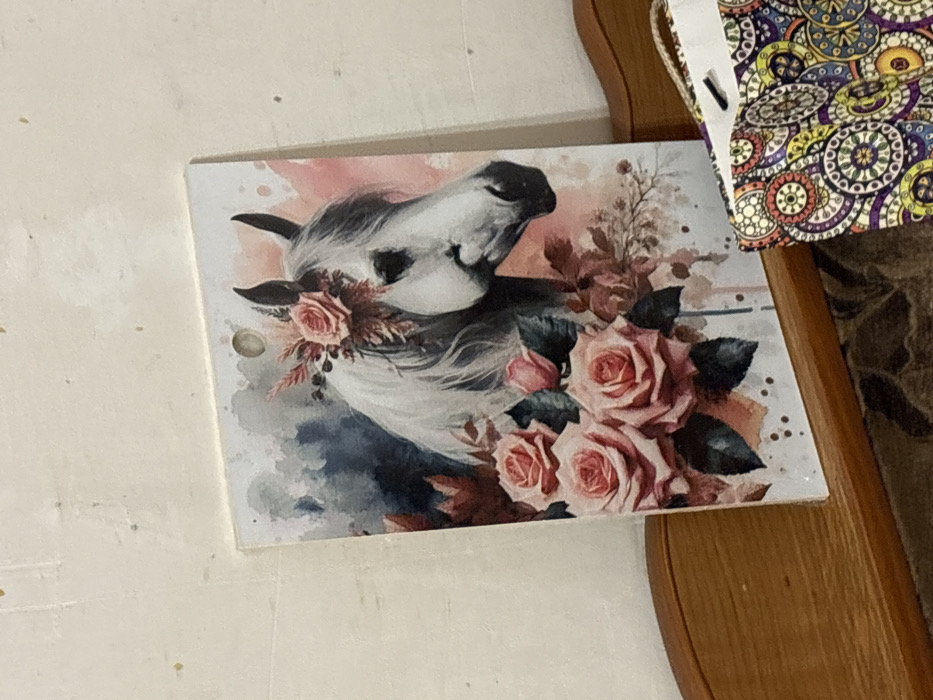 This image captures an indoor scene in Kuyuki, Russia, featuring a vertical rectangular decorative plaque resting against a light-colored wall on a curved, light-brown wooden surface, possibly a headboard or shelf. The plaque displays a watercolor-style artwork of a light-grey horse's head and neck, facing right, adorned with multiple pink roses and reddish-brown foliage. The background of the artwork features blended dark blue/grey and pale pink hues. A small circular hole is present near the top center edge of the plaque. To the right of the plaque, a portion of a fabric bag with a colorful, intricate mandala-like pattern in shades of purple, yellow, green, and orange is visible. The wooden surface sits above a darker, indistinct lower surface. No people are present.