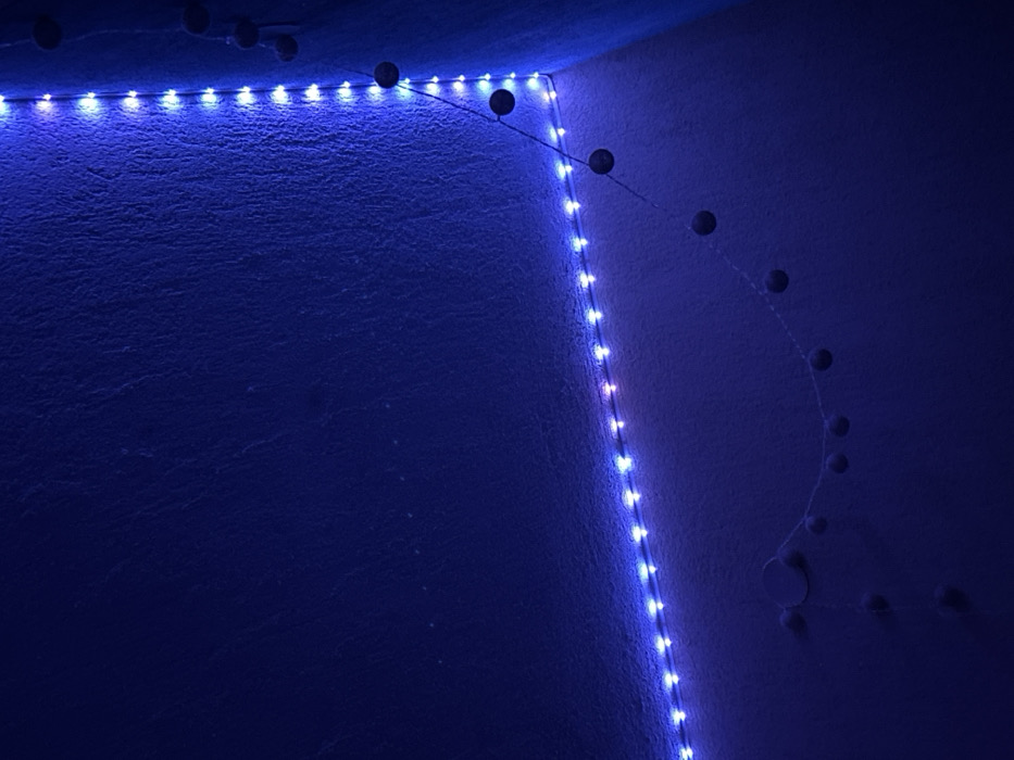 This image depicts an interior wall corner within a structure located in Sandanski, Bulgaria. The walls exhibit a textured surface, bathed in a predominant blue ambient light originating from an LED strip. This LED strip is affixed along the upper horizontal junction of the wall and extends vertically down the right-hand corner. Below and to the left of the vertical LED strip, a decorative string light is suspended. This string features multiple dark, spherical objects spaced at regular intervals along its length, drooping slightly between attachment points. A round, white, disk-shaped adhesive mount is visible on the lower-left wall, serving as one of the suspension points for the decorative string. No individuals or active subjects are present within the frame; the scene is static.