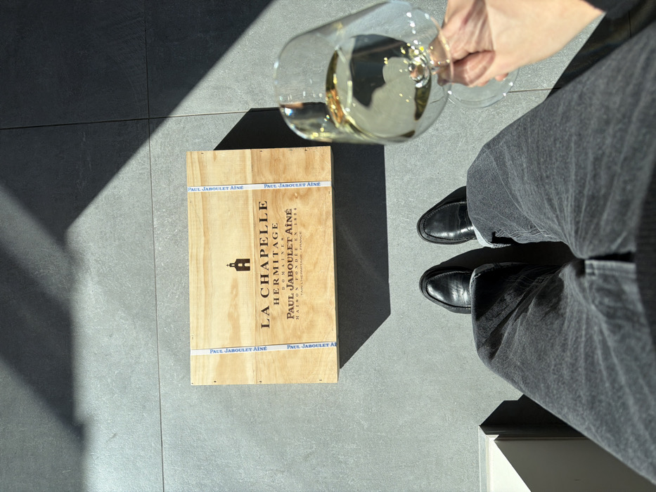 The scene depicts a top-down view of a person's lower body, a wine crate, and a glass of wine on a tiled floor in Marche-lez-Écaussinnes, Belgium. The environment features light gray rectangular floor tiles with visible grout lines. Direct sunlight illuminates the scene from the upper left, casting distinct, angular shadows across the floor and objects, including a large dark shadow in the upper right quadrant. A partial white object, possibly furniture, is visible at the far left edge of the frame. A light-colored wooden wine crate is positioned horizontally in the upper-middle section. Its visible top surface is printed with a chapel logo and text, including "LA CHAPELLE HERMITAGE DOMAINES PAUL JABOULET AÎNÉ MAISON FONDÉE EN 1834 TAIN L'HERMITAGE - FRANCE." Two vertical blue-and-white straps, bearing the repeated name "PAUL JABOULET AÎNÉ," secure the crate. Below the crate, the lower half of a person's body is visible. The person wears dark gray or black denim jeans with rolled cuffs and black leather loafer-style shoes on both feet. To the right of the person's right leg, a hand with fair skin tone grasps the stem and bowl of a clear stemmed wine glass, which contains a pale yellow-gold liquid consistent with white wine.