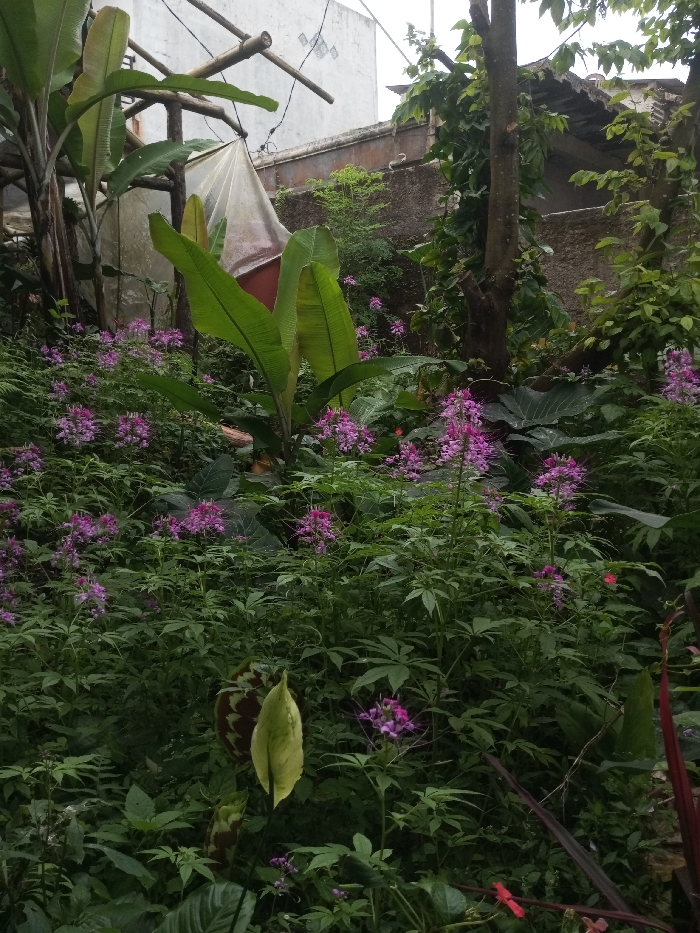 The image displays a dense, overgrown garden scene located in the city of Ivato, Madagascar. The foreground is filled with abundant green foliage, predominantly featuring numerous plants bearing vibrant purple-pink spidery flowers. Scattered among these are large, dark green leaves and a single distinct pale yellow-green leaf positioned towards the bottom center. In the midground, large-leafed plants, including banana trees, are visible. A rudimentary structure constructed from bamboo poles supports a translucent white tarp or plastic sheeting. The background reveals residential or utility structures: a light-colored building wall with electrical wiring on the left, and a darker, textured wall extending to the right. A section of a weathered, dark corrugated metal roof is partially visible behind the right-side wall and trees. The scene is illuminated by diffused, overcast lighting. No individuals or specific actions are depicted.
