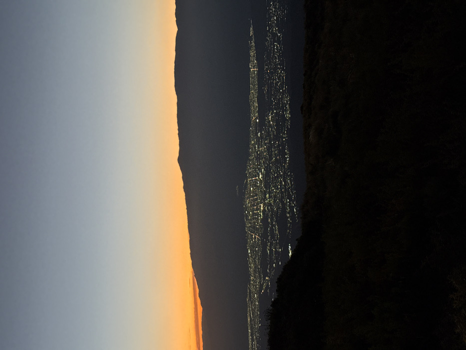 An elevated, wide-angle photograph captures the city of El Portezuelo, Argentina, at either dusk or dawn. The upper portion of the image features a gradient sky, transitioning from light blue at the zenith to a bright orange and yellow hue along the horizon, predominantly on the left. A dark, undulating mountain range forms a distinct silhouette across the mid-horizon, partially obscuring the vibrant sky colors. Below this mountain range, the sprawling city of El Portezuelo is visible, illuminated by a dense network of bright, yellowish-white artificial lights that delineate a clear grid pattern of streets and urban infrastructure. The lower foreground consists of a dark, undifferentiated mass of silhouetted terrain, likely an elevated hillside covered in vegetation, from which the city is observed. No people, discernible objects other than city lights and natural features, specific actions, or interactions are visible.