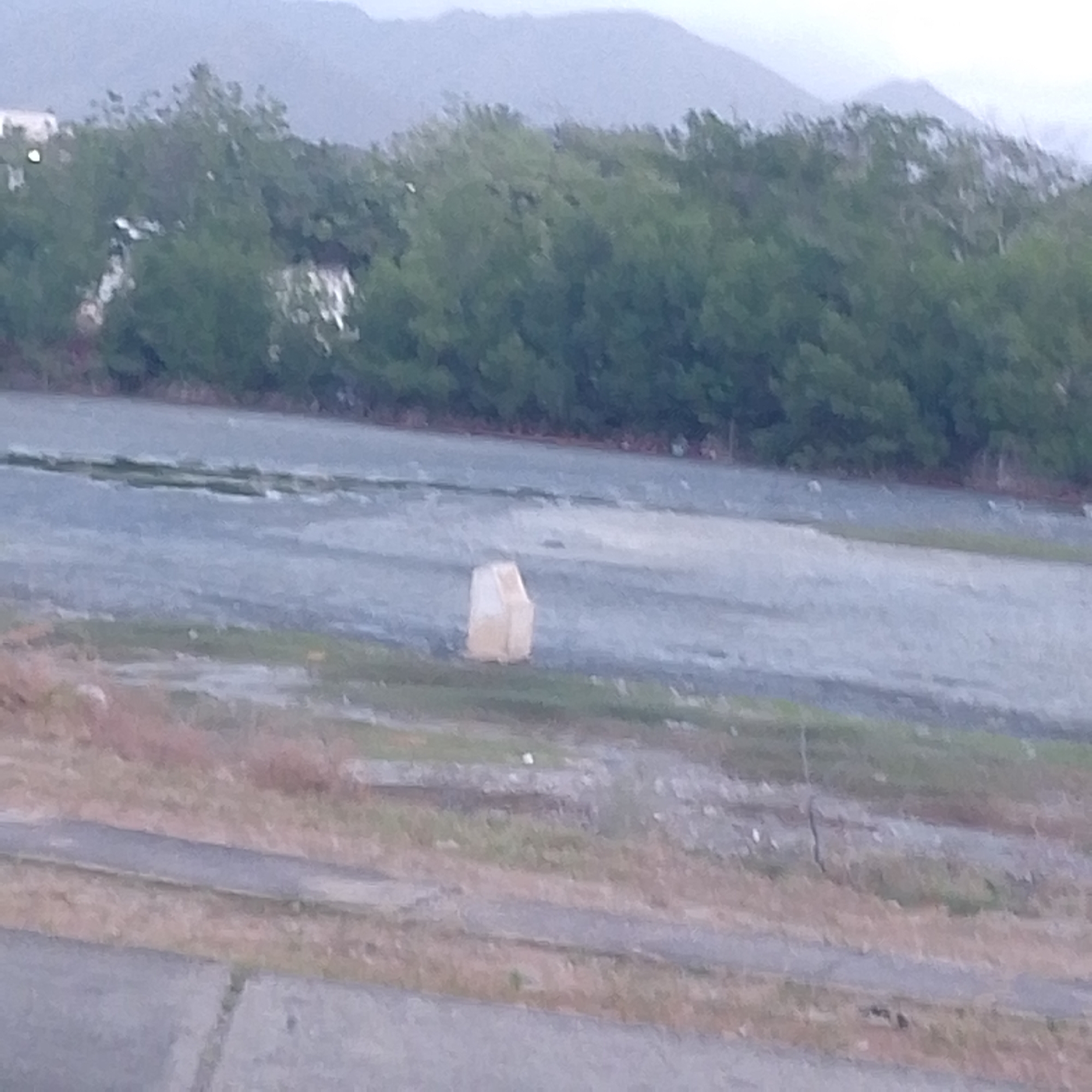 The image depicts a partially barren landscape near Juan Griego, Venezuela. The foreground is dominated by a paved area transitioning into dry, grassy terrain. A solitary, box-like structure stands in the middle ground. A dense line of trees marks the mid-ground horizon, behind which lie indistinct mountains under a cloudy sky. There are no visible people, interactions, or actions captured in the scene.