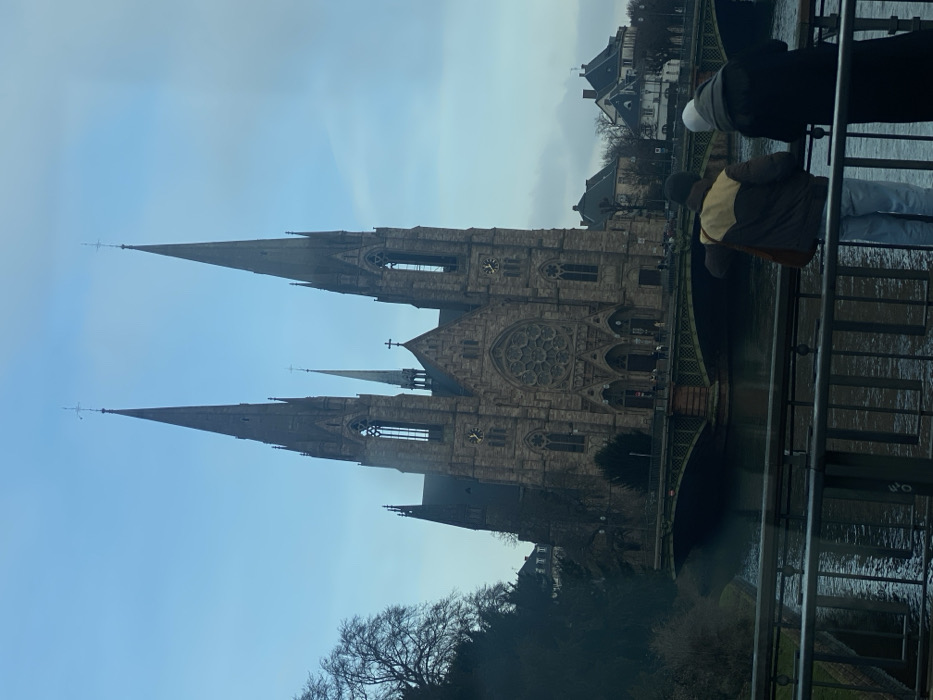 The image depicts an exterior view of the Église Saint-Paul de Strasbourg (St. Paul's Church) in Strasbourg, France, observed across a river on an overcast day. The Gothic Revival church, constructed of dark stone, dominates the background with its two prominent, tall spires topped with crosses, flanking a smaller central spire. A large rose window is visible on the main facade above multiple arched entrances, and clock faces are present on the upper sections of the primary spires. In the mid-ground, the Ill River flows horizontally, reflecting the sky and surrounding structures, with a multi-arched green metal bridge spanning its width directly in front of the church. Pedestrians are visible walking on this bridge. On the left riverbank, bare deciduous trees and some evergreen foliage are present. On the right bank, behind the church and bridge, additional buildings with dark sloped roofs are visible. In the immediate foreground, a dark metal railing, likely part of a promenade or another bridge, runs horizontally across the lower third of the frame. Two individuals are positioned with their backs to the viewer, leaning against this railing, observing the scene across the river. The person on the left wears a dark jacket with a lighter tan or beige yoke, light blue jeans, and a dark beanie, with their right arm slightly raised forward. The person on the right wears a long, dark coat and a light grey or white head covering. The sky is a light, hazy blue-grey, indicating overcast conditions.