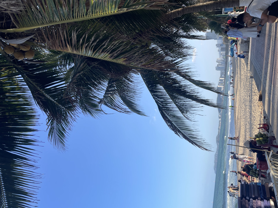 An outdoor scene depicts a busy tropical beach in Nha Trang, Vietnam, under a clear blue sky. The foreground is dominated by the dense fronds and trunks of several palm trees, with a cluster of green coconuts visible on one tree. These trees cast prominent shadows across a tiled promenade running parallel to the beach. On the promenade, towards the right, a male individual in a white t-shirt and dark shorts is seated, looking down at a device. Beside him, an individual in a white long-sleeved top and long white skirt/dress stands, facing left, with other obscured figures. Further left, two individuals wearing traditional conical hats (nón lá) attend to vendor stalls featuring piles of green coconuts. Red plastic stools and other vendor equipment are visible in this area. A stack of blue and black rectangular items, possibly mats or folded chairs, is positioned on the far left of the promenade, adjacent to a vendor setup. The sandy beach, located beyond the promenade, is populated by numerous individuals. Many are in the ocean or at the water's edge, where moderate waves are present. On the far left of the beach, a group of people is gathered around a light-colored horse, with one person appearing to interact with it. Other beachgoers are scattered across the sand, standing, sitting, or wading. The ocean extends to the horizon, where a distant cityscape with multiple multi-story buildings and a mountainous backdrop is visible under the clear sky, indicating the urban coastal setting of Nha Trang.