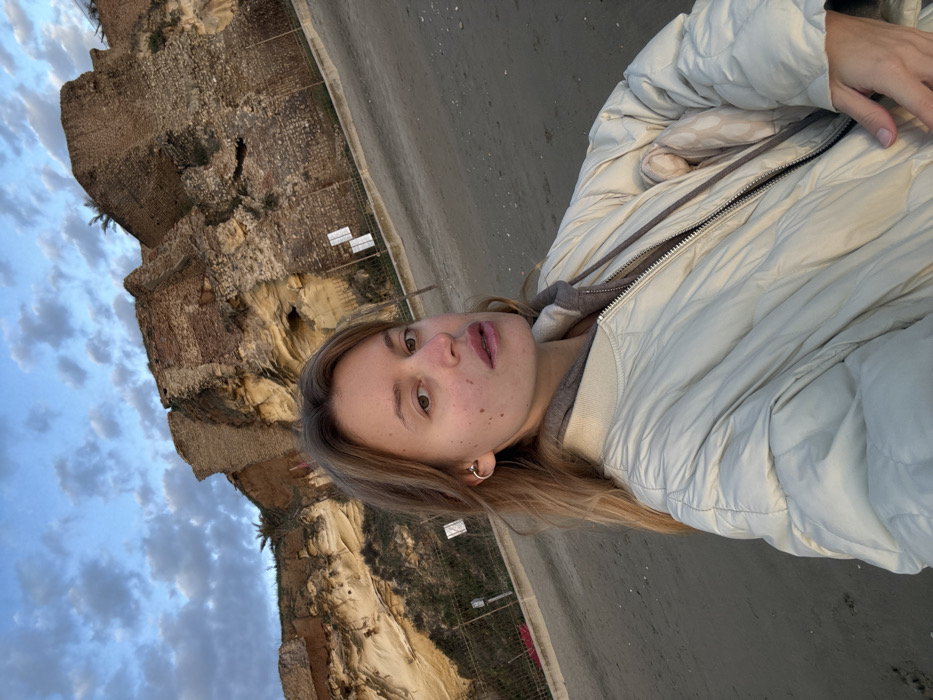 A young woman in a white jacket stands on a beach. To her left is a crumbling, ancient stone structure atop a cliff. The sky in the background displays a mix of light blue and cloudy formations. The beach appears sandy and stretches out beside her, leading towards the structure. The woman is facing the camera, her hair is blonde and shoulder length.