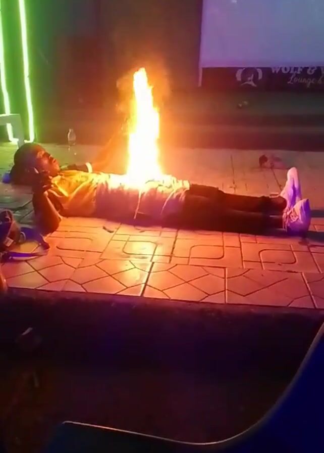 A man is lying on his back on a tiled surface, seemingly outdoors. There are flames burning on his torso, right in the center of his abdomen. He is wearing a yellow t-shirt, pants, and white sneakers. His arms are resting at his sides. In the background, there are neon lights, a projected image, and signage for "Wolf Lounge & Bar." The camera angle is relatively low, and the footage appears to be taken from a seated position, given the presence of a blue chair in the foreground. Loud music can be heard.
