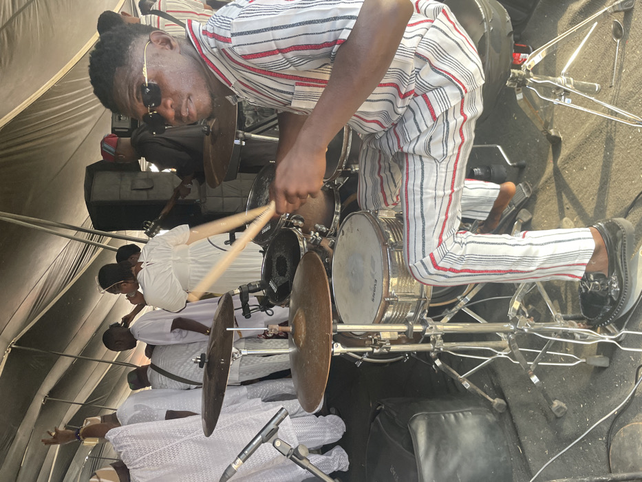 A drummer in a white and red striped suit is intensely playing a drum kit. Several drums and cymbals surround him. People in white garments stand below, looking towards the drummer with raised hands. The scene unfolds indoors, under a tent-like structure, adding to the ambiance. The setting appears to be a church service.