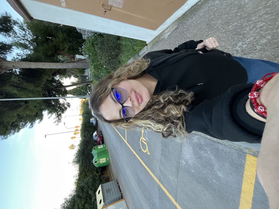 A female, appearing to be in her late 20s or early 30s, with light complexion and long, curly blonde and light brown hair, is captured in a selfie-style photograph. She wears dark-rimmed glasses with reflective blue-tinted lenses, a black hooded sweatshirt, and blue jeans. A red bracelet with white cross-shaped beads adorns her left wrist, and a silver-colored ring is visible on her right ring finger. She is smiling faintly and looking directly into the camera. The scene is outdoors, during what appears to be late afternoon or early evening, evidenced by the warm, diffused lighting. She stands on a light-colored paved surface, possibly a sidewalk, adjacent to an asphalt road. The road features a double yellow line marking and a yellow painted disabled parking symbol. Along the left side of the road, a grey recycling bin and two green, cylindrical glass recycling bins are present. Further down the road, multiple cars are parked, including a red sedan and a white vehicle. The roadside is lined with dense green hedges and tall pine trees. In the background, numerous palm trees and streetlights are visible against a clear, pale blue sky. To the right of the subject, a section of a light brown panel or building wall is visible, with the partial inscription "FACU" suggesting a "Facultad" (Faculty) building. Beyond this, a grassy area with small blue flowering plants is visible. This location is identified as the Burjassot-Paterna Campus of the University of Valencia, located in Paterna, Spain.
