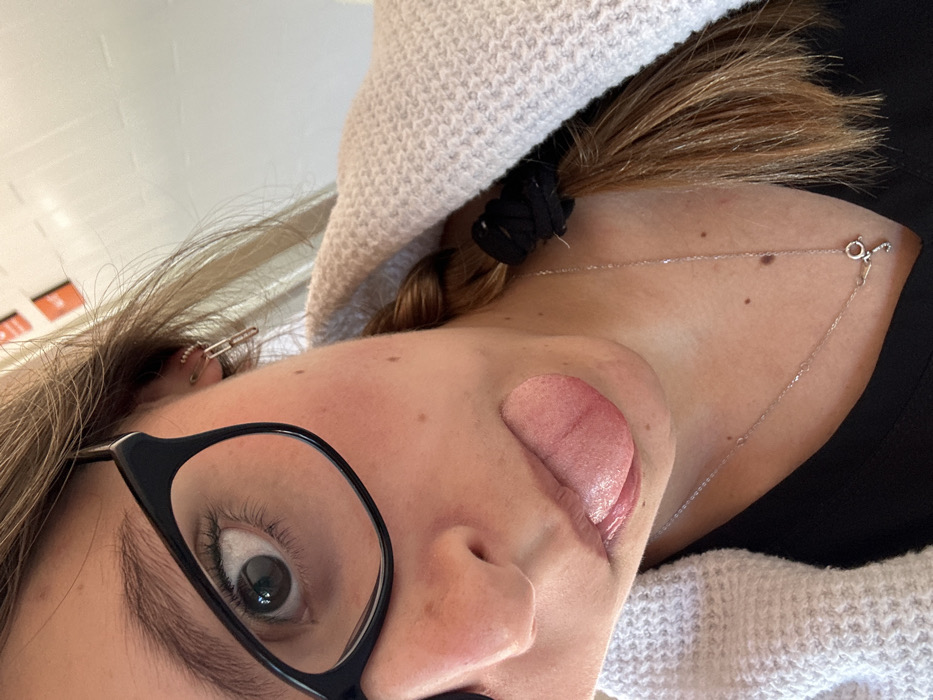 This image depicts a close-up, angled view of an individual, stated to be located in Interlomas, Mexico. The subject is a person, appearing to be a female, with light brown hair pulled back with a black scrunchie. She wears black-framed eyeglasses, through which her left eye is visibly wide open, directed towards the camera. Her tongue is extended from her mouth, angled towards the lower left of the frame. The individual wears multiple earrings in her visible left ear: a small silver stud in the helix and a longer, silver chain-link style earring. A thin silver necklace with a small, indistinct pendant is visible around her neck. She is dressed in a black garment, partially obscured by a light-colored, possibly knitted, outer garment draped over her shoulders. The background is out of focus, suggesting a shallow depth of field. It consists primarily of light-colored walls or surfaces. Vaguely discernible red and black markings or objects are present on the far wall, one of which appears to be a sign with a white "!!" symbol. The lighting is bright and even.