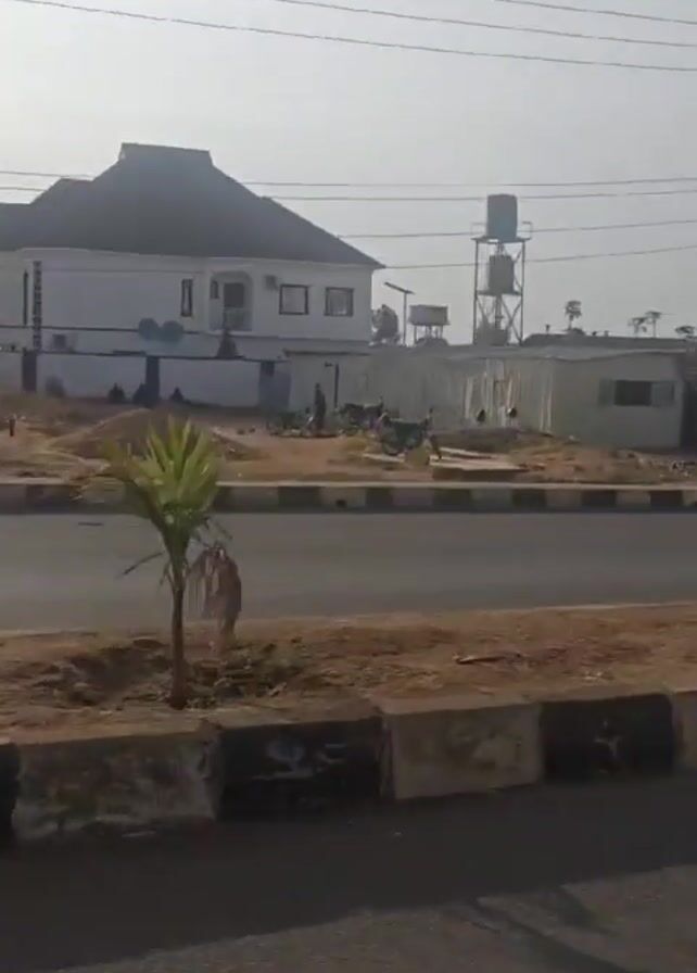 The camera moves along a paved road with a raised median of dirt and concrete. On one side of the road is a two-story white house with a dark roof and a water tower behind it. Further down the road are some tin sheds. On the opposite side of the road are several buildings, some of which appear to be shops. There are a few vehicles and people visible in the distance. A white car passes by on the road. The sky is hazy and pale.