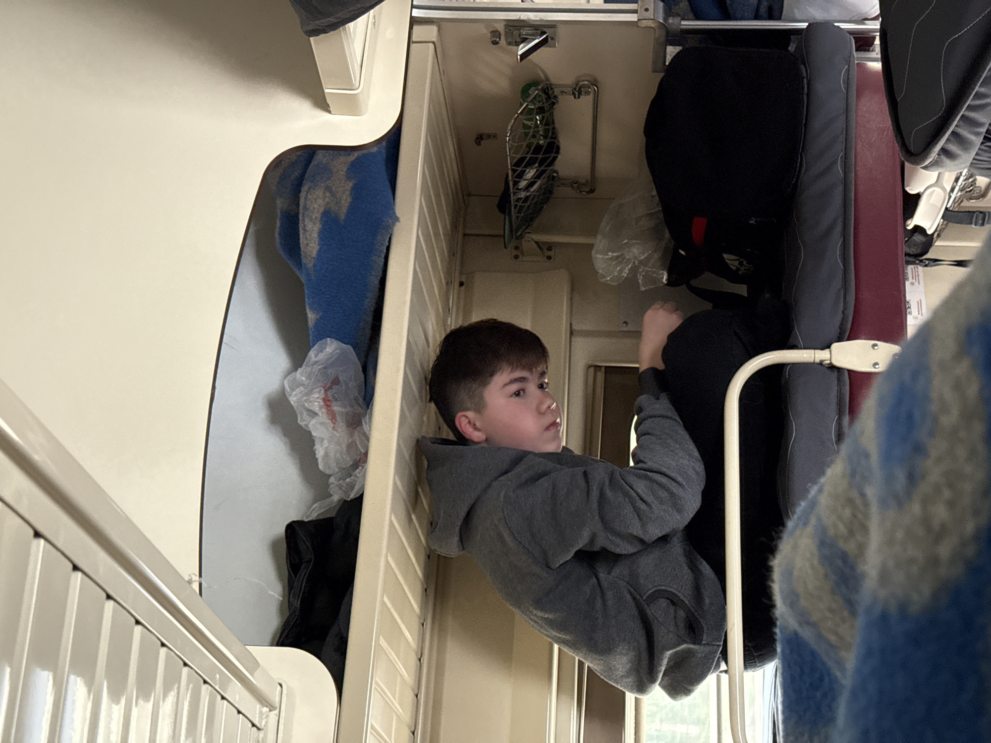Inside a train compartment, a boy wearing a gray hooded sweatshirt sits near the window. Luggage and bedding are stowed overhead. A blue blanket is draped over the compartment’s side. Overhead compartments are filled with belongings and a water bottle in a net. The compartment has a vintage or older appearance.