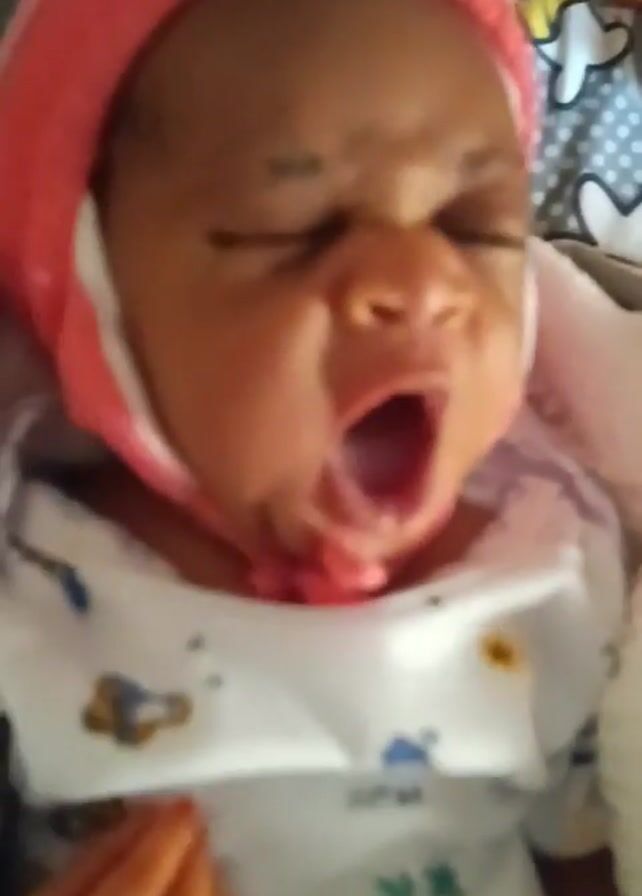 close-up of a baby wearing a pink bonnet and a white onesie with palm tree and turtle designs. The baby is lying down and yawns widely, then looks to the side. The background includes a bedsheet with cartoon patterns and a white blanket.