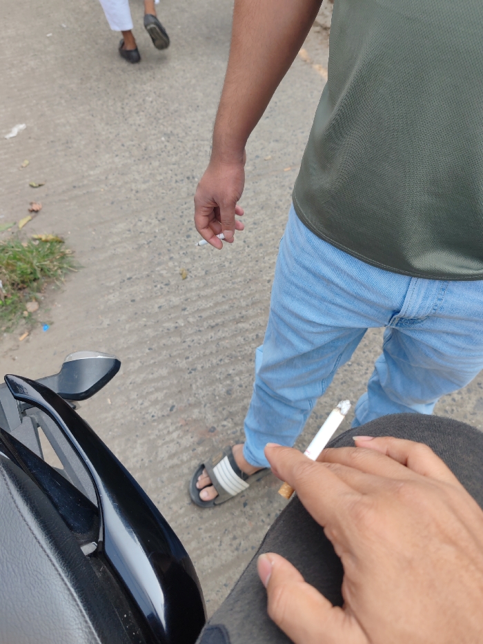 A person sits on a black motorcycle, holding a lit cigarette in their right hand. Another person, wearing blue jeans and a green shirt, stands nearby, also holding a cigarette. The ground is paved. Parts of two additional people are visible in the background. The person holding the lit cigarette wears a dark-colored pant. The person nearby wears sandals.