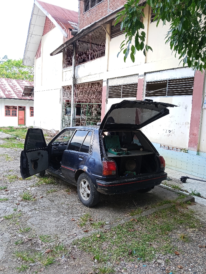 A dark blue four-door hatchback vehicle is parked on an unpaved surface of dirt and patchy grass in the city of Unknown, Unknown. The driver's side front door and the rear hatch are both fully open. The vehicle's exterior shows dirt accumulation, particularly on the lower body and light-colored alloy wheels. Inside the open rear hatch, a large circular speaker (subwoofer) is visible within an enclosure at the base, topped by a shelf. A green toolbox containing various items is positioned on this shelf. The interior of the open driver's door reveals an integrated speaker. In the background, a multi-story cream-colored building with visible weathering and markings on its walls occupies the right side of the frame. It features horizontal barred windows on its lower floor and a section with vertical metal grating. An upper floor displays elements of red brick and a wooden balcony with metal bars. To the left and further back, a smaller, white building with a damaged or incomplete red corrugated metal roof is present, featuring two brown-framed windows and a matching door. Green tree foliage extends into the upper right corner of the scene, casting some shadows. The ground is irregular, composed of exposed dirt, gravel, and sparse green grass, with a concrete edge bordering the car's right side. No individuals are present.