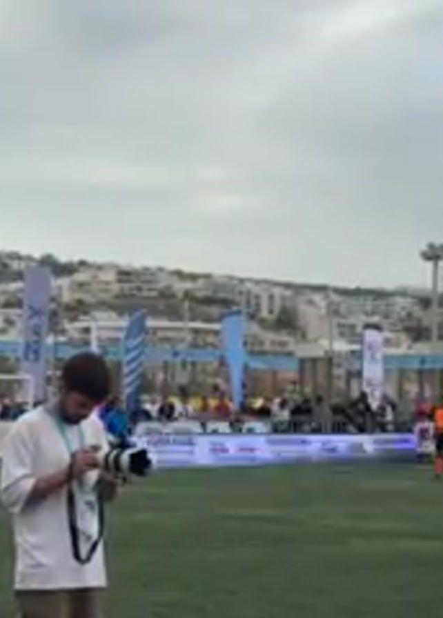 beach soccer match. The photographer is in the foreground looking at the back screen of his camera. Behind him on the field of play is a player in blue kicking the ball into the net, celebrating. The crowd behind him is cheering, and advertising banners and flags line the field. In the background, there are buildings on a hillside. The sky is overcast.