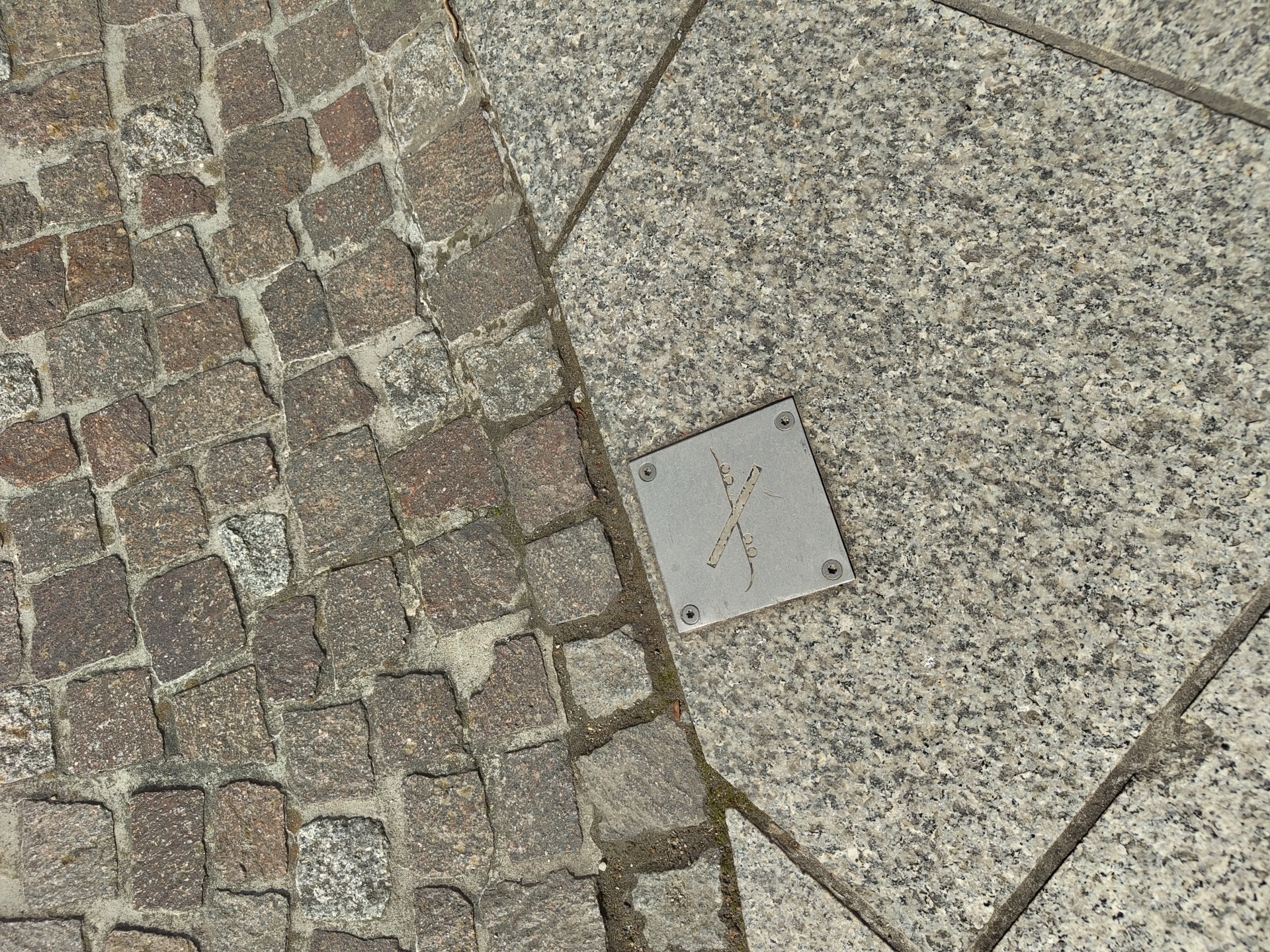 The image displays an overhead, ground-level view of a paved surface in Bertrange, Luxembourg, under daylight. The upper portion consists of irregular, reddish-brown and grey granite cobblestones set in mortar or sand. This cobblestone section diagonally borders a lower area of grey, speckled granite flagstones. A square, brushed metallic plaque is affixed to the granite flagstone surface using four visible screws, one in each corner. The plaque features an etched symbol: two diagonally crossed, elongated lines, resembling ski poles, with two small circular elements and curved lines below them, indicative of goggles. No people or active events are present.