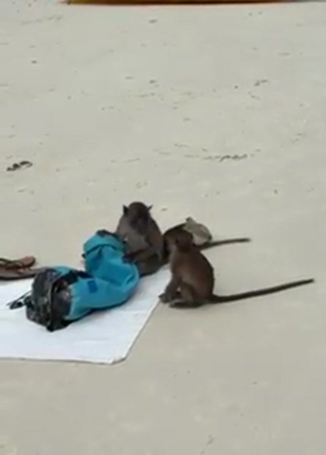 two monkeys on a sandy beach. A tan kayak and a dark blue kayak are visible in the background. To the left of the monkeys is a blue backpack, a pair of flip flops, and a light tan hat. Both monkeys are sitting down and looking around. The larger monkey reaches for the backpack at one point. The smaller monkey is next to it. They are on top of a white towel that is placed on the sand.