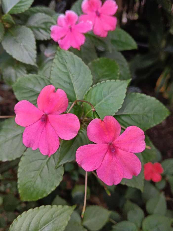 The image presents a close-up view of a plant featuring multiple bright fuchsia-pink flowers and dark green foliage, located in the city of Unknown, Vietnam. In the foreground, two distinct five-petaled flowers are centrally positioned, each displaying a darker pink stamen area. Their petals are broad and somewhat notched. Surrounding these flowers are numerous ovate, serrated-edge leaves with visible venation. Further back, two additional blurred fuchsia-pink flowers are visible near the top of the frame. A smaller, deep red-pink flower is partially discernible in the lower right background. The background consists of dark, unfocused foliage. No individuals or specific actions are depicted. The scene is illuminated by natural light.