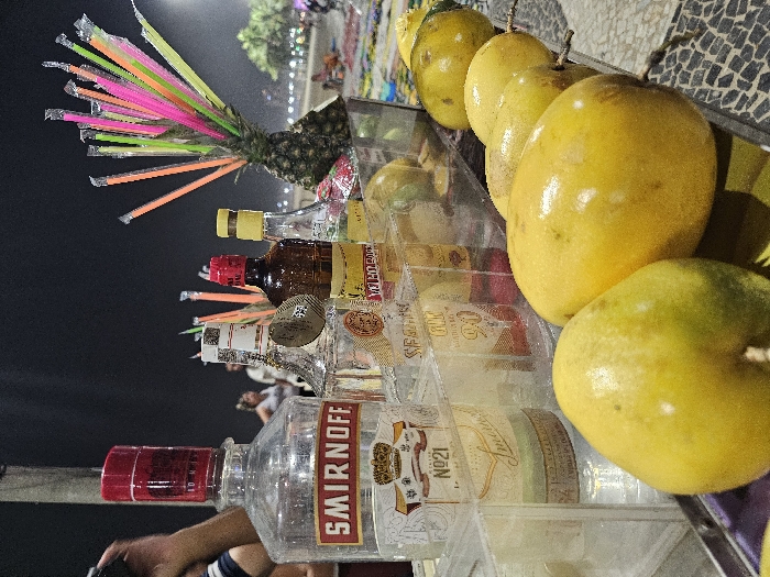 The image displays a street vendor's stall at night on the distinctive black and white mosaic pavement of the Copacabana or Ipanema promenade in Rio de Janeiro, Brazil. The stall, illuminated by artificial light, features a transparent display containing various bottles of spirits, including a prominent Smirnoff No. 21 vodka bottle and an amber bottle labeled "VELHO." A row of approximately eight large, yellow passion fruits lies on a metallic surface in front of the bottles. To the right, a pineapple is decorated with a dense cluster of assorted brightly colored plastic straws (pink, green, yellow, orange). A person's arm, holding a mobile device, is visible on the far left. In the blurred background, several indistinct figures are present, suggesting a bustling environment along the illuminated beachfront or street under a dark sky.