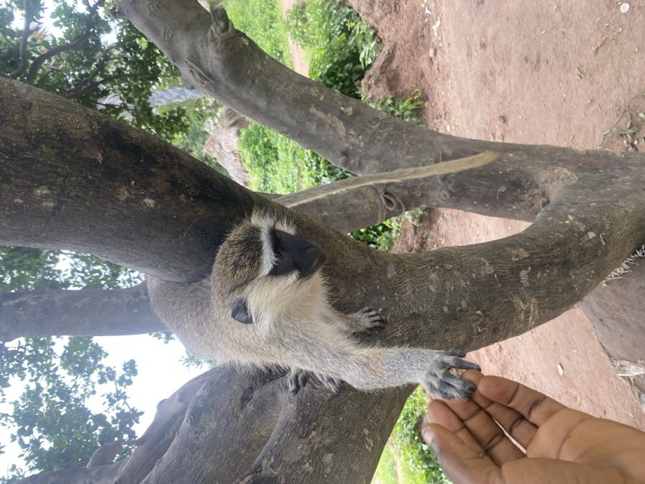 The image depicts an interaction between a greenish-grey monkey and a human hand in Zaki Biyem, Nigeria