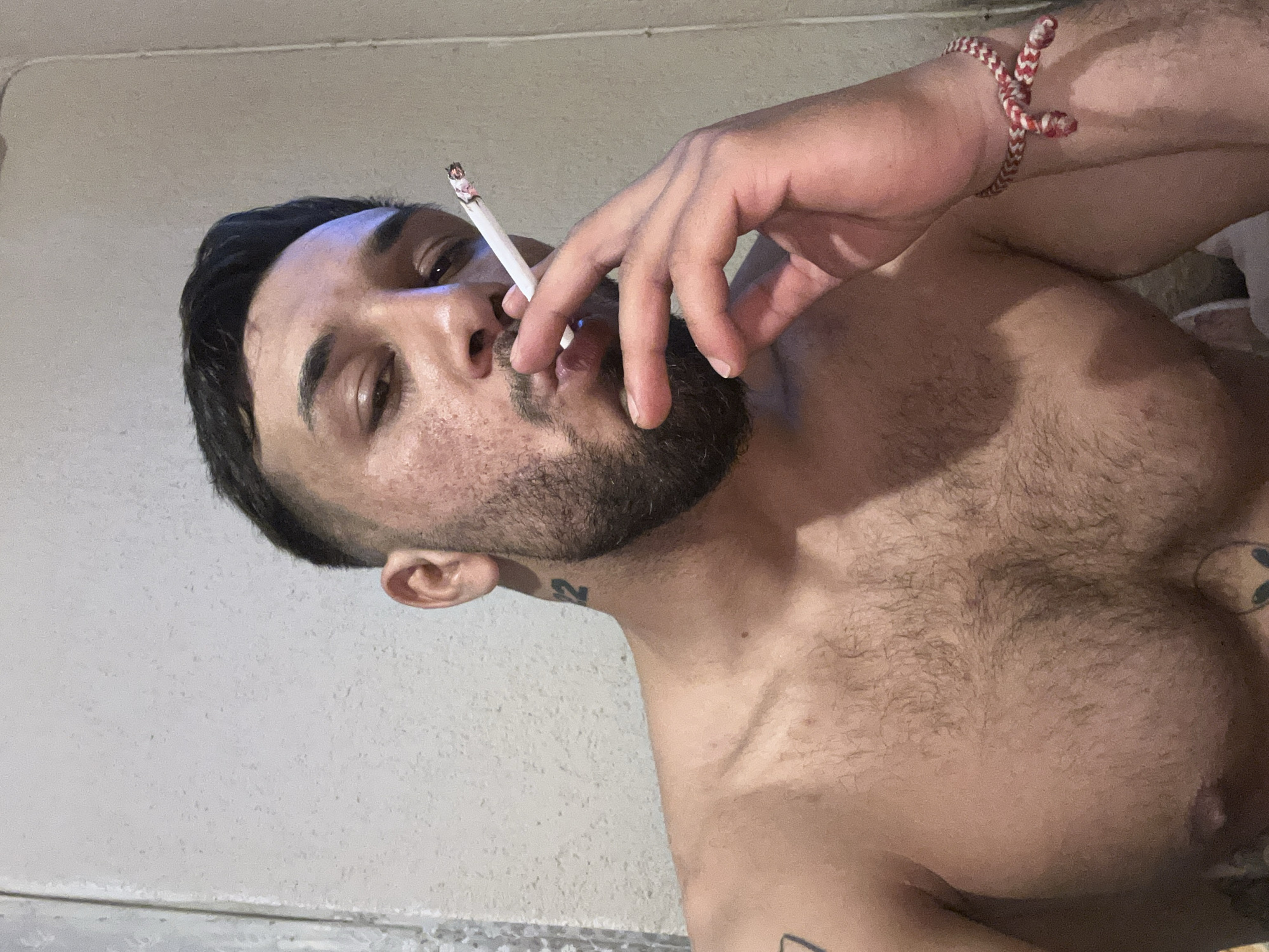 n adult male, appearing to be in his 20s or 30s, captured in a close-up, chest-up view. He is bare-chested, displaying a muscular build with significant dark hair on his chest and abdomen. His head is slightly tilted, and he looks directly forward. He has short, dark hair with a faded style on the sides, and a dark beard and mustache. The subject is actively smoking a lit cigarette, which he holds between his right thumb and index finger near his lips. The cigarette's tip is glowing orange with a small column of ash. A black tattoo of the number "12" is visible on the left side of his neck. The top edge of another dark tattoo is visible on his left shoulder/arm, and a partial outline of a design, possibly an alien head, is visible on his lower right pectoral area. On his right wrist, he wears a braided bracelet of red and white cords, tied with two knots. The background consists of a plain, light-colored, textured wall, consistent with an indoor environment. The lighting suggests an artificial source, with a faint bluish hue present on the left side of his face. The scene takes place in the city of Tsarevo, Bulgaria.