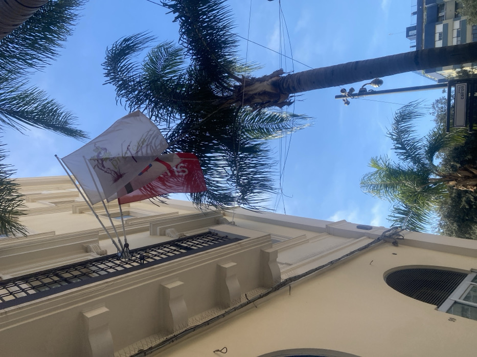 The image displays an upward-angled view of a street scene in Brindisi, Italy, specifically on Via Cairoli, indicated by a street sign visible in the lower right. A multi-story building, light-toned and likely of plaster or stucco construction, occupies the left side of the frame. This building features a balcony with a dark metal railing and decorative corbels underneath. Bird deterrent spikes are affixed along a horizontal ledge below the balcony. Two flags are mounted on poles extending from the building facade: an upper white flag with a multi-colored emblem or crest, and a lower red flag featuring a white logo, partially readable as "S". Several palm trees are prominent; their fronds frame the upper portion of the image, and a tall, slender palm trunk stands vertically on the right. The sky is clear and blue. A street light pole, equipped with a surveillance camera, is positioned on the right side of the frame. Overhead utility wires traverse the sky. No individuals or active events are depicted.