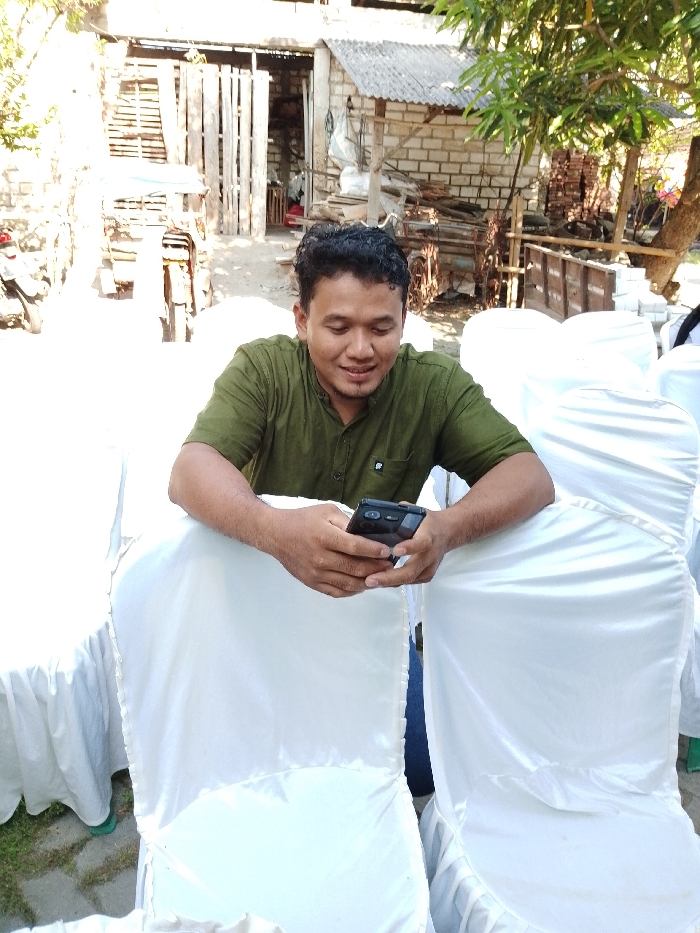 A male subject is depicted in an outdoor setting within the city of Juwana, Indonesia. He is positioned leaning forward, with his forearms resting on the back of a white fabric-covered chair. He has dark, curly hair, a light beard, and is wearing an olive-green short-sleeved collared shirt. His head is tilted downwards, and he is looking at a black smartphone held horizontally with both hands, exhibiting a faint smile. Surrounding him are multiple similar white fabric-covered chairs, indicative of an event setup. In the background, to the left, a light-colored motor tricycle and a partial white scooter are visible near a wooden slatted structure. To the right, a building with light-colored brick or block walls and a corrugated roof is present, surrounded by stacks of various materials, including wood and potentially bricks. A tree with green foliage provides natural shade on the right side of the frame. The ground appears to be a mix of dirt, gravel, and some light-colored paving stones. The scene is illuminated by bright daylight.