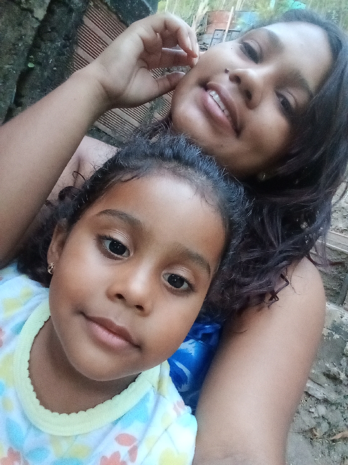 Two individuals pose for a selfie, with the younger one positioned in the foreground and the other slightly behind. The child wears a light-colored shirt with floral patterns. The woman has curly hair and a radiant smile. The background appears to be outdoors, with elements of greenery and brickwork visible. They are close, likely family members.
