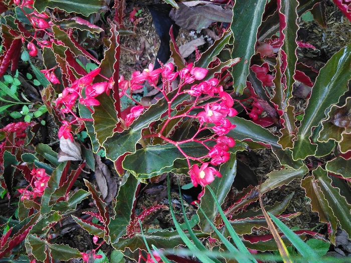 The image displays a close-up, top-down perspective of a flowering plant characterized by dark green leaves with distinct reddish-brown, crinkled margins, outlined by a thin, lighter green or yellowish edge. Multiple clusters of small, vibrant hot pink flowers are prominently featured, each flower exhibiting a cup-shaped or bell-like form with discernible white or pale yellow reproductive structures at its center. The plant is situated within a natural environment, with a background consisting of dark soil or mulch, interspersed with decaying leaves and additional indistinct green foliage. On the far left, slender blades of lighter green grass are visible. No individuals, actions, or interactions are present in the scene. The specific location within the city of San Cristóbal, Costa Rica, is not discernible from the visual information provided.