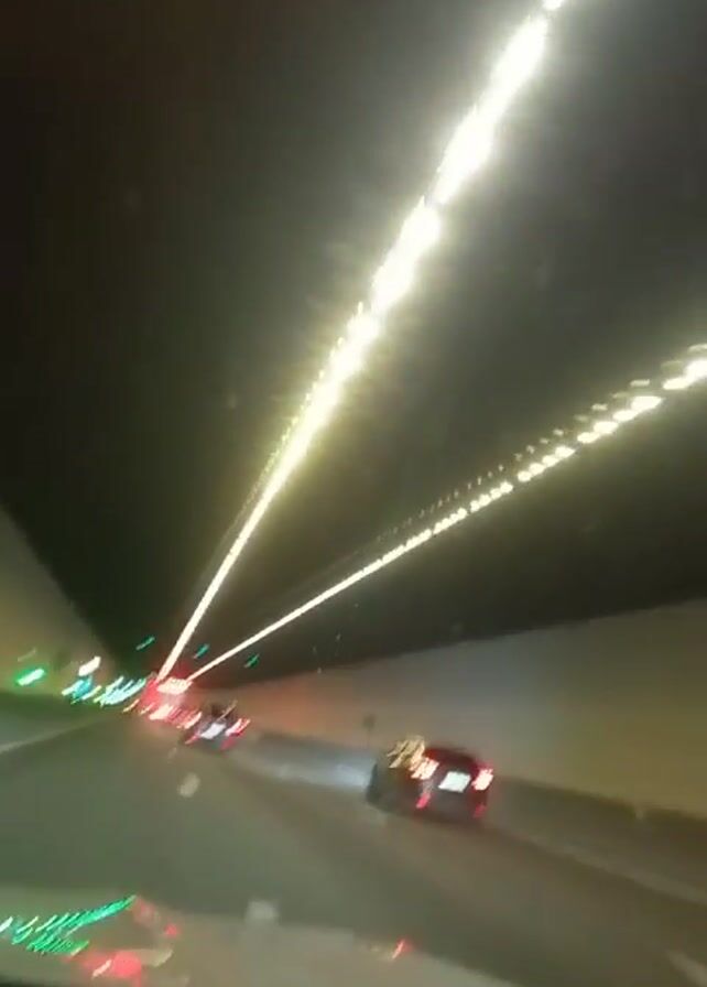 car driving through a tunnel. The tunnel has white walls and bright, linear lights overhead. Several other cars are visible ahead, and green and blue lights mark the tunnel walls. The perspective is from the driver's seat. The car is moving forward smoothly on a multi-lane road with painted white lines. The interior of the driver's dashboard is partially visible.