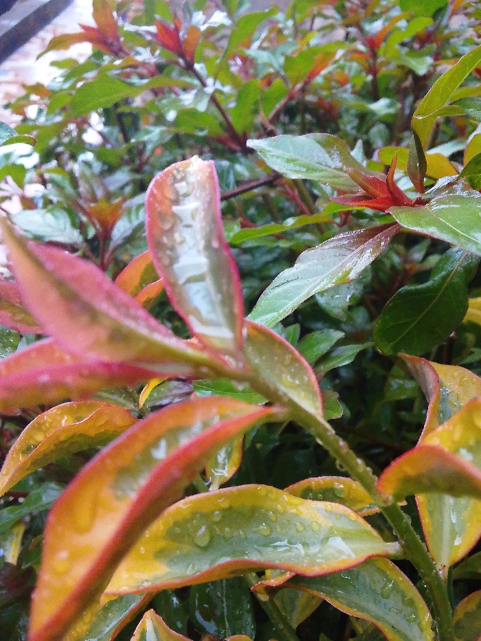 This image captures a close-up view of wet plant foliage in Ndeiya, Kenya. The foreground features several leaves, predominantly variegated with vibrant red, orange, and yellow margins transitioning to green centers. These leaves are covered with numerous small, transparent water droplets, indicative of recent rainfall or heavy dew. A prominent leaf in the upper-left foreground shows a distinct curl, with its surface glistening from the water. In the background, out of focus, dense green and reddish-green leaves from the same or similar plant are visible, also appearing wet. No people, animals, or man-made structures are present in the frame. The lighting suggests an overcast sky, providing soft, diffused illumination.