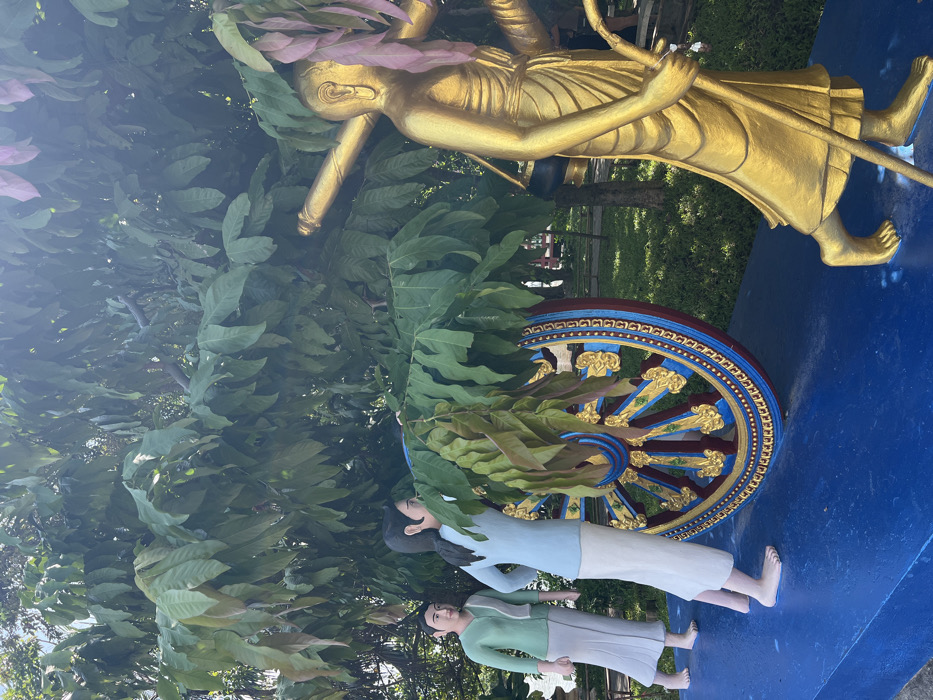 A golden statue of a robed figure stands above a blue platform. Below, two smaller painted figures in traditional clothing rest. Between the figures and the golden statue, a large wheel with a red hub, gold spokes, and a blue outer rim serves as a backdrop. Lush green foliage partially obscures the figures and the wheel. The scene is outdoors, and shadows suggest a sunny day.