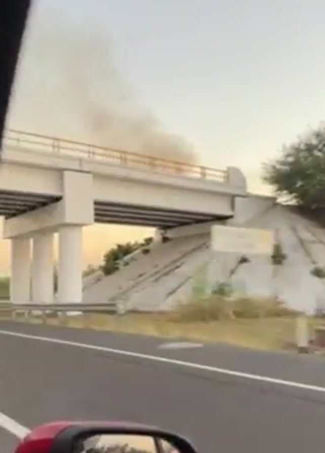 car driving on a highway. Out of the car window, a plume of dark smoke rises into the air in the distance, against a sunset sky. The camera passes under a concrete overpass. Trees and vegetation are visible along the side of the road. The driver’s side mirror of the car is visible in the lower left corner.
