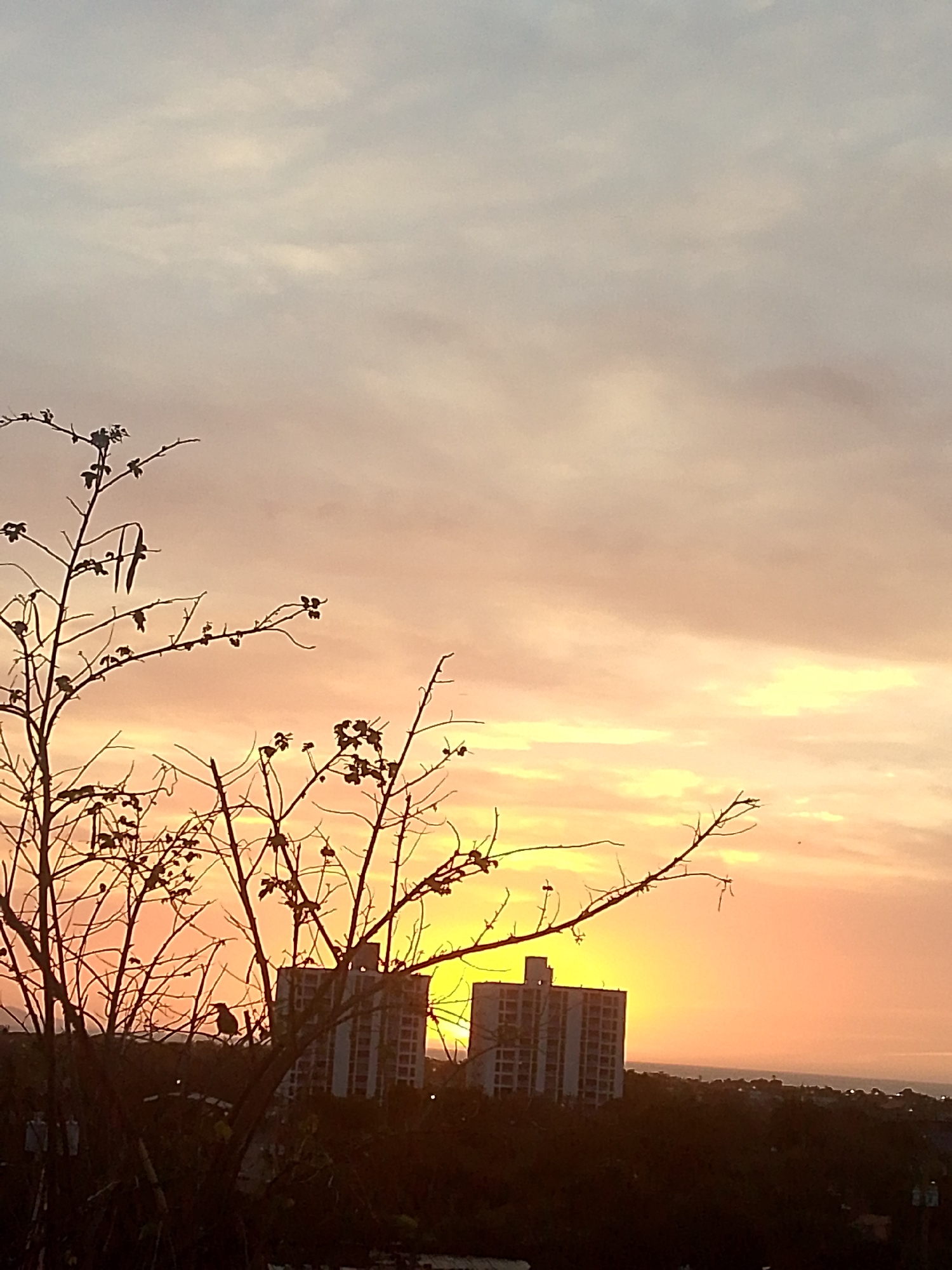 Captured in Juan Griego, Venezuela, the image depicts a vibrant sunset partially obscured by a leafless tree in the foreground. Silhouetted against the fiery sky are two tall, light-colored buildings. A bird is perched on one of the tree's branches. The horizon shows a hint of the ocean.