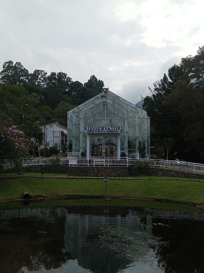 This image depicts a botanical garden scene in the city of Ambositra, Madagascar. The central focus is a large, modern glass greenhouse with a high-pitched roof and a metal frame structure, featuring a prominent sign above its entrance that reads "KONSERVATORI KEBUN RAYA CIBODAS" in dark blue lettering. The greenhouse is situated on an elevated, manicured grassy area, fronted by a low stone wall and a white railing with square balusters, which outlines a paved walkway. A gentle ramp extends to the right behind the railing. In the foreground, a dark body of water, likely a pond or calm lake, occupies the lower half of the frame, reflecting the greenhouse and surrounding foliage. The water's surface shows minor ripples and some scattered organic material. Immediately bordering the water is a strip of neatly maintained green grass, upon which two small, dark ground-level lights are visible. A dark pipe or log is partially submerged on the left side of the water's edge. In the background, dense, dark green trees rise behind and to the sides of the greenhouse, suggesting a forested hillside. A white building with a darker roof is partially visible among the trees to the left of the greenhouse. The sky above is overcast with light grey clouds. No individuals, explicit actions, or interactions are visible within the scene.