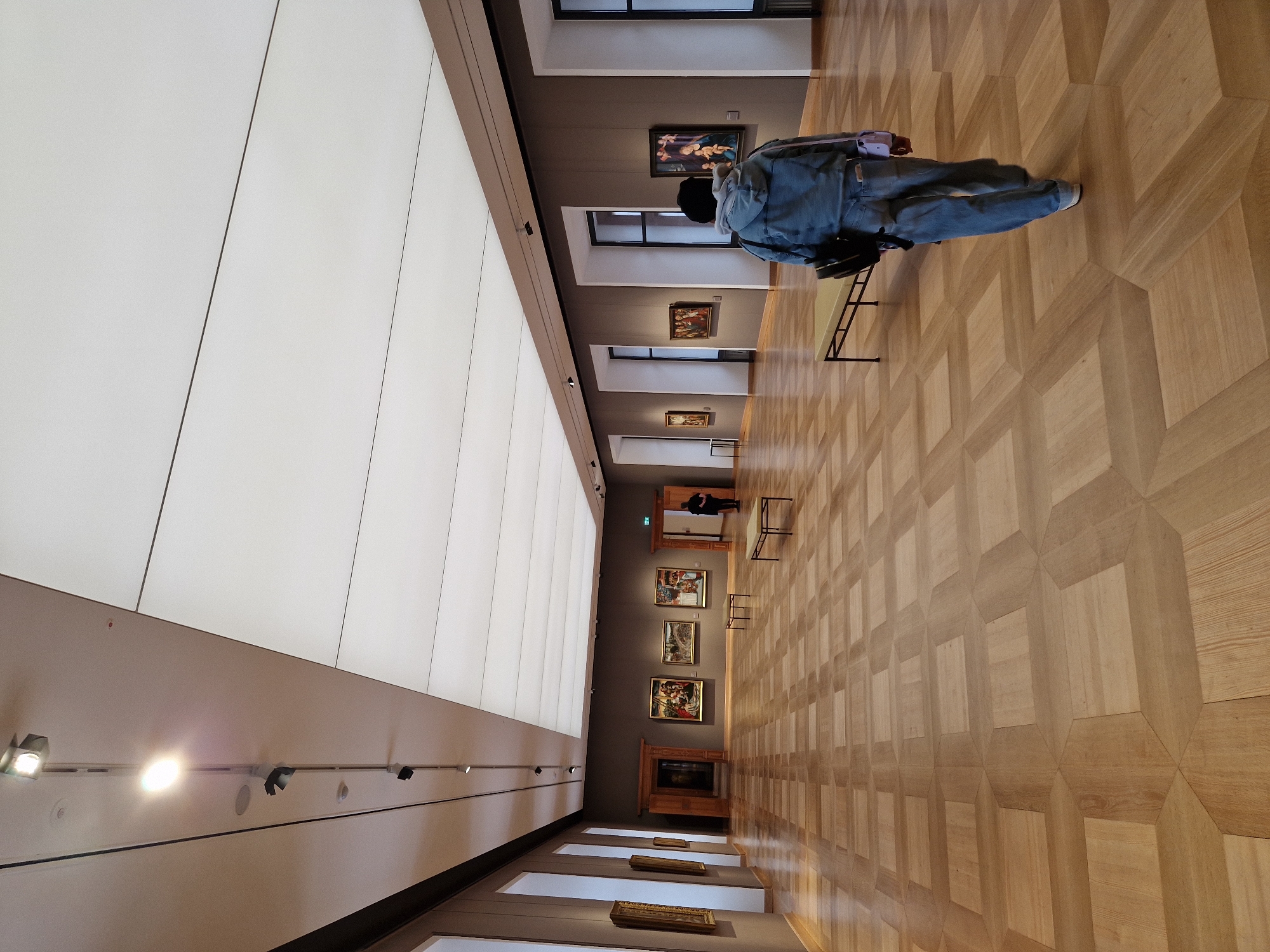 The image depicts an interior view of a long, rectangular art gallery hall within the Staatsgalerie at Schloss Johannisburg in Aschaffenburg, Germany. The hall features a polished light-brown wooden parquet floor arranged in a geometric, cube-like pattern. The walls are painted a neutral grey-brown and display multiple framed Old Master paintings. In the foreground, a person is observed from behind, walking towards the distant end of the hall. This individual wears a light-blue denim jacket over a grey hooded garment, blue jeans, and light-colored shoes. They carry a black backpack on their left shoulder and a small light-purple bag in their right hand. Further down the hall on the right side, a second person, dressed in dark clothing, stands near a wooden doorway. The ceiling features a combination of lighting elements: a track lighting system with multiple spotlights runs along the left side, and a large central rectangular panel provides diffused white light. Several framed paintings of various sizes are visible on both the left and right walls. The right wall also shows two elongated, backless benches with light-colored cushioned tops and dark metal frames. Architectural features include recessed vertical sections, possibly windows or niches with dark frames, along both side walls, and two ornate wooden doorways in the background, leading to other rooms.