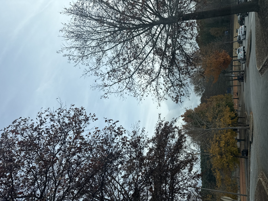 The image captures a cloudy sky framed by tree branches with sparse leaves, suggesting late autumn or early winter. Below, the landscape includes trees with varying degrees of foliage. A paved road runs along the right side of the image, with parked vehicles visible in the background. The overall scene depicts a calm, somewhat barren outdoor environment.