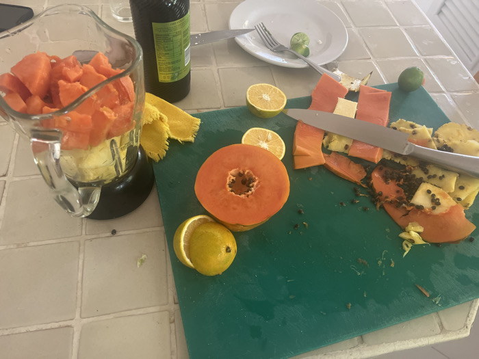 A high-angle shot reveals smoothie preparation on a tiled surface. A blender with chopped papaya sits beside a green cutting board, which holds papaya halves, slices, pineapple pieces, and citrus fruits, including lemons and limes. A large knife rests on the cutting board. Other elements include a bottle, a plate, and a fork.