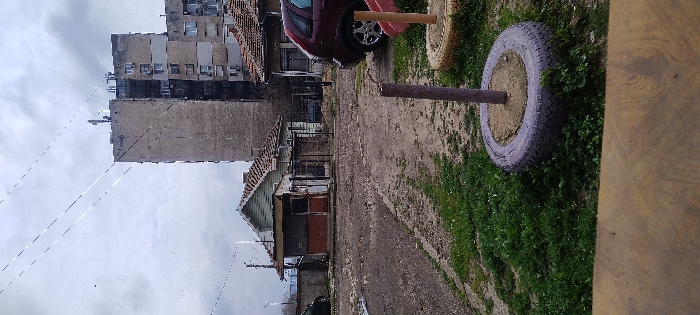 The image depicts an urban street scene in Lom, Bulgaria, under an overcast sky. In the immediate foreground, a wooden surface occupies the bottom fifth of the frame. Above this, a grassy area with patches of exposed dirt is visible, featuring two repurposed tires. The tire on the left is painted purple and has a wooden post embedded upright in its center, surrounded by dirt. To its right, an unpainted tire with a partially visible red plastic component, possibly part of playground equipment, rests on the ground. The midground is dominated by an unpaved dirt and gravel road showing wet patches or puddles. To the left of the road, a small, single-story building with a gabled, tiled roof stands behind a metal fence. Its lower facade is reddish-brown, and the upper section is light green, featuring a red door and a small window. To the right of the road, the front-right quarter of a dark red hatchback vehicle is parked. Behind the car, a section of another building with a tiled roof is visible. In the background, two multi-story residential buildings are prominent. The central structure is a tall, narrow building constructed from concrete or brick, displaying visible wear and numerous windows on its visible side. Communication antennas or equipment are mounted on its roof. To its right, an adjacent or connected multi-story building features standard apartment windows and balconies. Overhead, multiple power lines traverse diagonally across the grey, cloudy sky. No individuals are present in the scene, and no specific actions are observed.