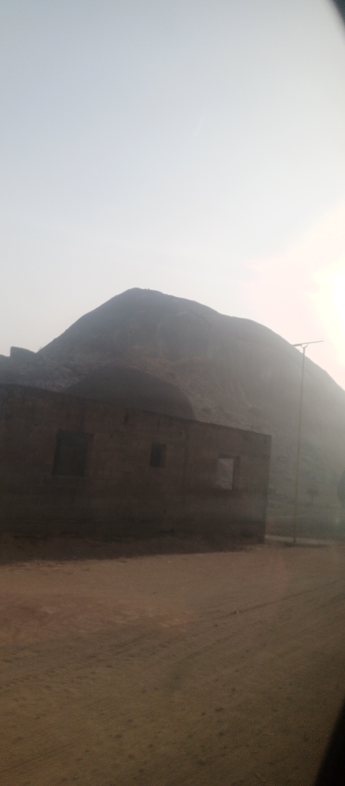 A landscape features a squat, rectangular building with three visible window openings. Behind it, a large, hazy hill or mountain looms against a pale, overcast sky. To the right of the building, a tall, slender pole stands. The ground is a textured, dirt surface. The overall scene has a muted color palette, creating a somewhat desaturated and hazy appearance, possibly due to dust or fog.